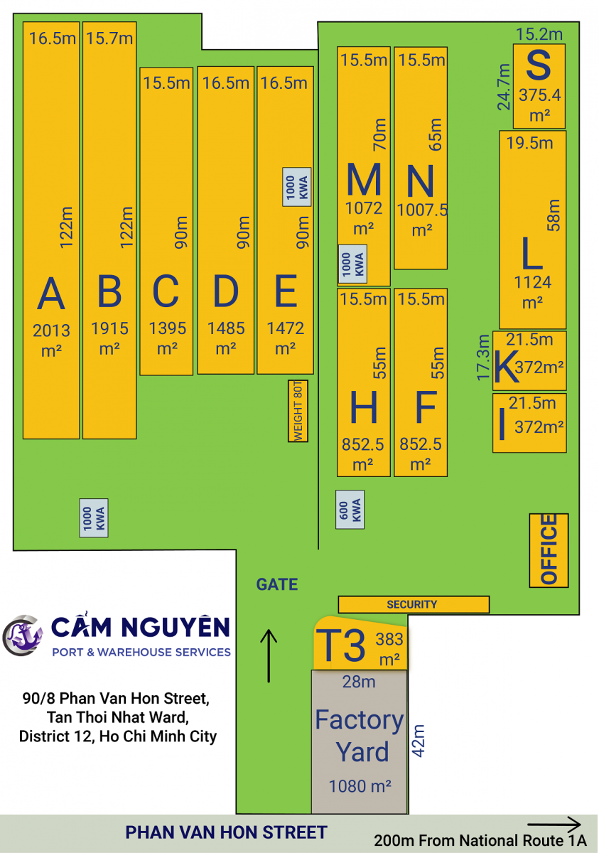 | Tổng diện tích đât: 2.6 ha Tổng diện tích kho xưởng 16.586m2 Diện tích tối thiểu: 375m2 Trọng tải sàn: 2.5 – 3 tấn/m2 Nguồn điện: 3 pha EVN |